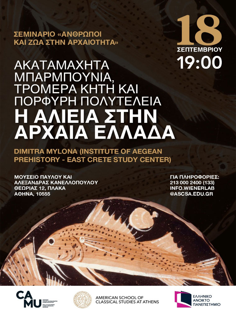 Υβριδική διάλεξη της Δήμητρας Μυλωνά (Ινστιτούτο Αιγαιακής Προϊστορίας-Κέντρο Μελέτης Ανατολικής Κρήτης) με θέμα «Ακαταμάχητα μπαρμπούνια, τρομερά κήτη και πορφυρή πολυτέλεια. Η αλιεία στην αρχαία Ελλάδα».
