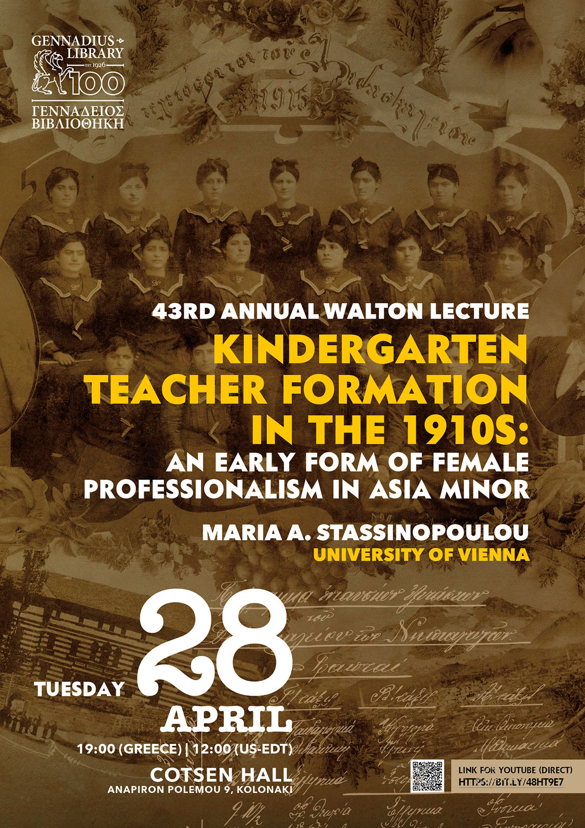 «Kindergarten Teacher Formation in the 1910s: An Early Form of Female Professionalism in Asia Minor» (Η εκπαίδευση των νηπιαγωγών στη δεκαετία του 1910: Μια πρώιμη μορφή γυναικείου επαγγελματισμού στη Μικρά Ασία) είναι ο τίτλος διάλεξης που θα δώσει (στα αγγλικά) η Μαρία Α. Στασινοπούλου (Πανεπιστήμιο Βιέννης), στο πλαίσιο της Ετήσιας Διάλεξης Walton που διοργανώνουν η Γεννάδειος Βιβλιοθήκη και η Αμερικανική Σχολή Κλασικών Σπουδών στην Αθήνα.