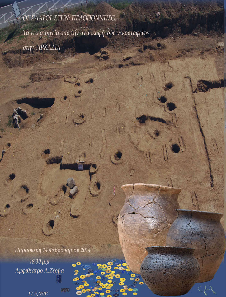 Διάλεξη του δρος Δημήτρη Αθανασούλη (Διευθυντή της 25ης Εφορείας Βυζαντινών Αρχαιοτήτων και επικεφαλής της ερευνητικής ομάδας που αποτελείται από τους: Νατάσα Βασιλείου, Κέλυ Κουζέλη, Susanne Μεταξά, Χρύσα Μπούρμπου, Πένυ Κολιάτση και Φρόσω Πλατή) με θέμα «Οι Σλάβοι στην Πελοπόννησο. Τα νέα στοιχεία από την ανασκαφή δύο νεκροταφείων στην Αρκαδία».