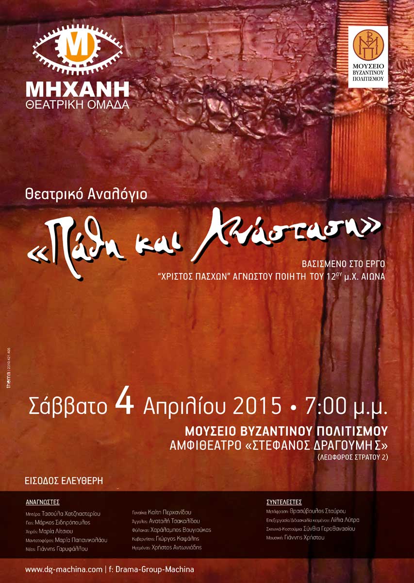 Το θεατρικό αναλόγιο με τίτλο «Πάθη και Ανάσταση», που δημιούργησε η Θεατρική Ομάδα «Μηχανή», και είναι βασισμένο στο μεσαιωνικό δράμα «Χριστός Πάσχων», αγνώστου ποιητή του 12ου αι., θα φιλοξενήσει το Μουσείο Βυζαντινού Πολιτισμού.