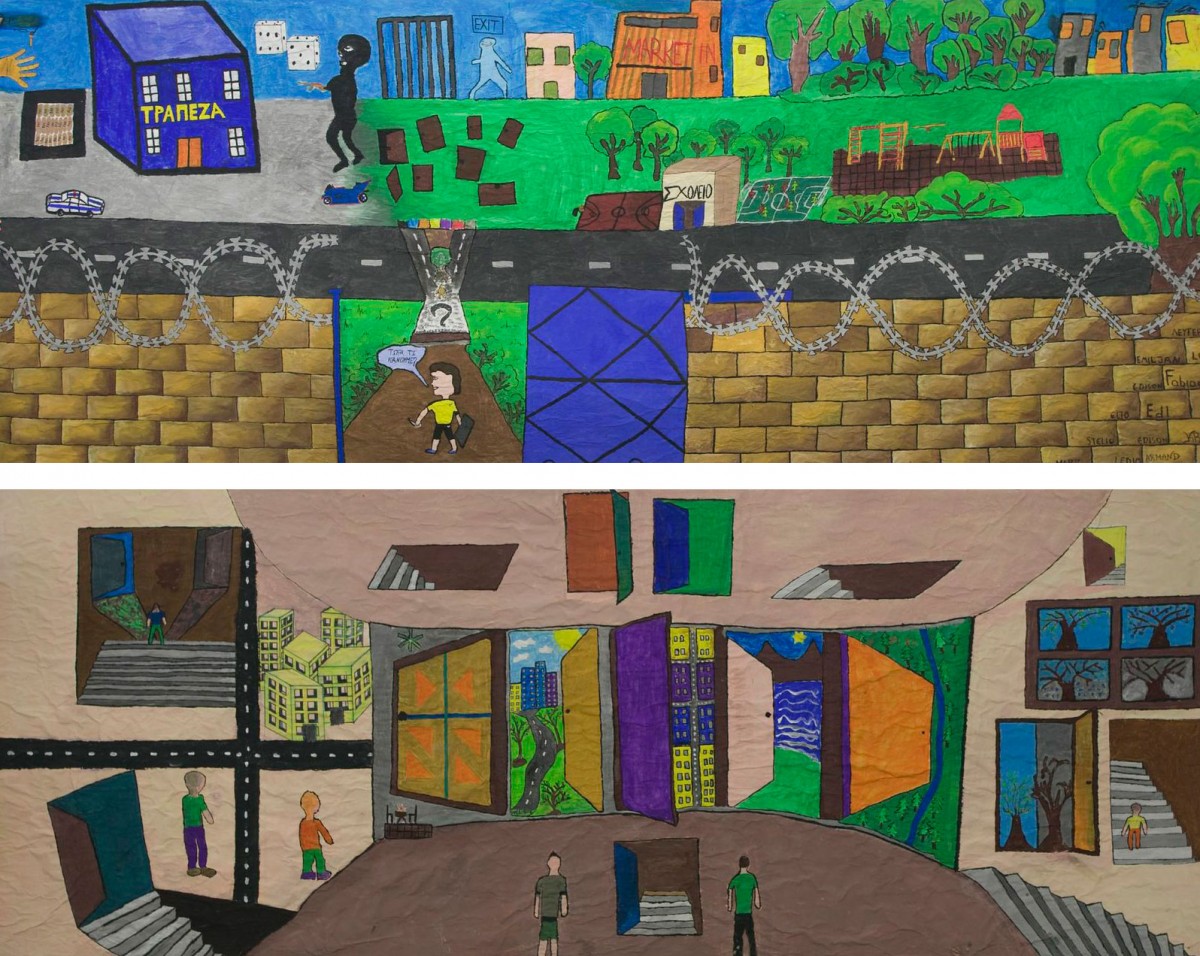 Τα συγκεκριμένα έργα επιλέχθηκαν γιατί πραγματεύονται με επιτυχία θέματα όπως μετανάστευση, διαχωριστικές γραμμές, αποκλεισμός, πόλεμος, βία, ρατσισμός, ανθρώπινα δικαιώματα, δημόσιος/ιδιωτικός χώρος, φυσικές καταστροφές κ.ά., θέματα τα οποία συζητήθηκαν και αναλύθηκαν στις συναντήσεις στο σχολείο των φυλακών. Κάθε μαθητής δημιούργησε ένα προσχέδιο το οποίο στη συνέχεια βρήκε το δικό του «χώρο» σε ένα μεγάλων διαστάσεων έργο. Η ενδιαφέρουσα «τοιχογραφία», με τα έντονα χρώματα, πραγματεύεται τους διαφορετικούς δρόμους που θα κληθούν να επιλέξουν όταν αποφυλακιστούν. Η ανασφάλεια και ο φόβος είναι συναισθήματα έκδηλα στην παλέτα τους. Ακολούθησε ένα δεύτερο έργο το θέμα του οποίου προέκυψε όταν ένας μαθητής διαπίστωσε ότι «ελευθερία είναι να έχεις πολλές επιλογές».