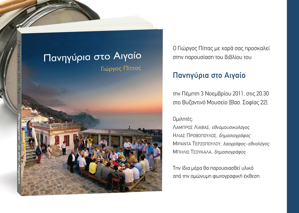Παρουσίαση του βιβλίου του Γιώργου Πίττα με τίτλο ” Πανηγύρια στο Αιγαίο” θα πραγματοποιηθεί στο Βυζαντινό και Χριστιανικό Μουσείο Αθηνών. Στην παρουσίαση θα μιλήσουν ο εθνομουσικολόγος Λάμπρος Λιάβας, η λαογράφος-εθνολόγος Μιράντα Τερζοπούλου και οι δημοσιογράφοι Ηλίας Προβόπουλος και Μπήλιω Τσουκαλά.