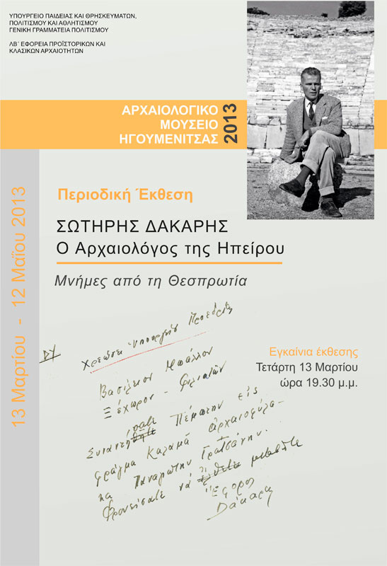 Περιοδική έκθεση με τίτλο «Σωτήρης Δάκαρης. Ο Αρχαιολόγος της Ηπείρου. Μνήμες από τη Θεσπρωτία» φιλοξενεί η ΛΒ’ Εφορεία Προϊστορικών και Κλασικών Αρχαιοτήτων στο Αρχαιολογικό Μουσείο Ηγουμενίτσας.