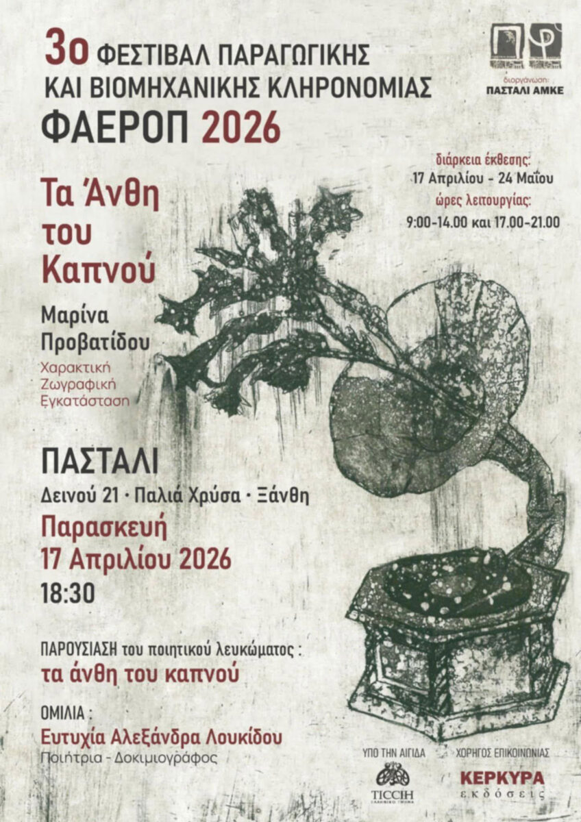 Στο πλαίσιο του 3ου Φεστιβάλ ΦΑΕΡΟΠ 2026, ο Σταθμός Βιομηχανικής Αρχαιολογίας ΠΑΣΤΑΛΙ ανοίγει τις πόρτες του για να φιλοξενήσει την πρώτη εικαστική έκθεση στον χώρο του, με τίτλο «Τα άνθη του καπνού», της εικαστικού Μαρίνας Προβατίδου.