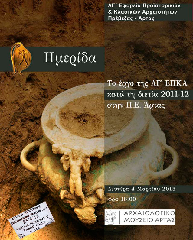 Ημερίδα για την παρουσίαση και προβολή στο κοινό των εργασιών που υλοποιήθηκαν τη διετία 2011-2012 στα όρια της Π.Ε. Άρτας, τόσο στο πλαίσιο συγχρηματοδοτούμενων από το ΕΣΠΑ έργων και υποέργων όσο και της ευρύτερης δράσης της ΛΓ’ Εφορείας Προϊστορικών και Κλασικών Αρχαιοτήτων.