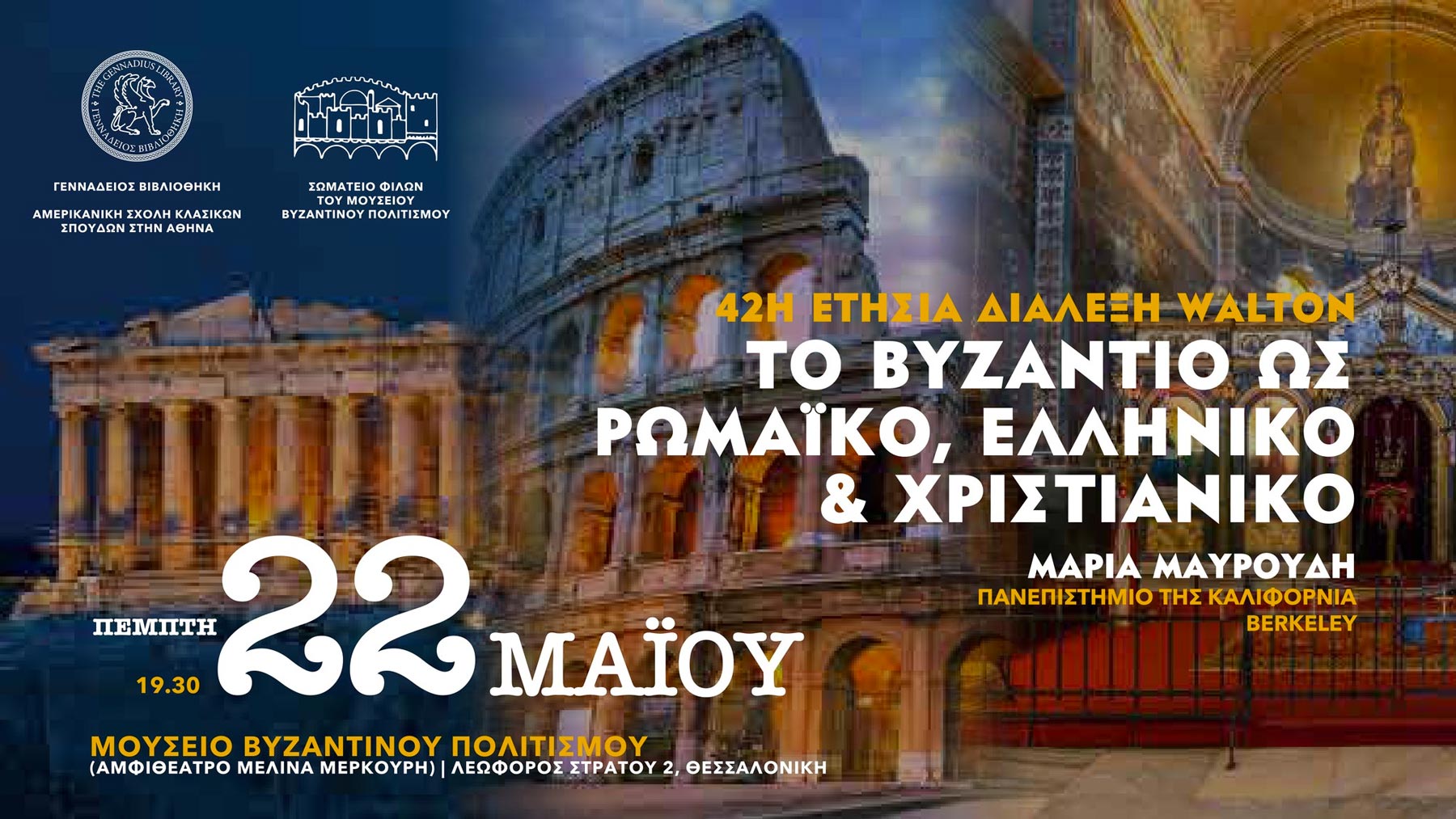 Διάλεξη της ιστορικού Μαρίας Μαυρουδή, καθηγήτριας στο Πανεπιστήμιο Βerkeley των ΗΠΑ, με θέμα «Το Βυζάντιο ως ρωμαϊκό, χριστιανικό και ελληνικό» διοργανώνουν το Σωματείο των Φίλων του Μουσείου Βυζαντινού Πολιτισμού και η Γεννάδειος Βιβλιοθήκη.