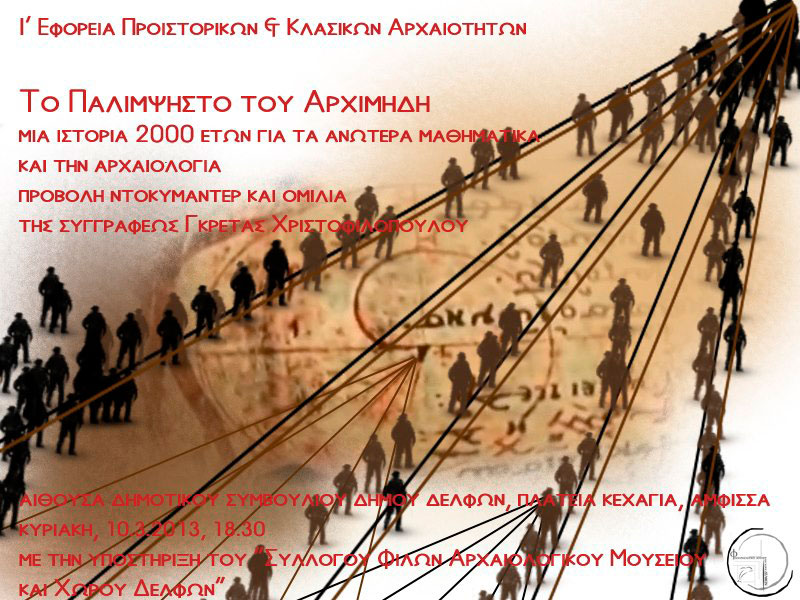 Εκδήλωση με τίτλο «Το Παλίμψηστο του Αρχιμήδη – Μία ιστορία 2.000 ετών για τα ανώτερα μαθηματικά και την αρχαιολογία» διοργανώνει η Ι’ Εφορεία Προϊστορικών και Κλασικών Αρχαιοτήτων με την υποστήριξη του Συλλόγου Φίλων Αρχαιολογικού Μουσείου και Χώρου Δελφών.