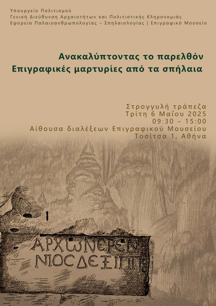 Ημερίδα με θέμα «Ανακαλύπτοντας το παρελθόν. Επιγραφικές μαρτυρίες από τα σπήλαια», συνδιοργανώνουν η Εφορεία Παλαιοανθρωπολογίας-Σπηλαιολογίας και το Επιγραφικό Μουσείο στο πλαίσιο της προώθησης της επιγραφικής έρευνας και της ανάδειξης της σημασίας των επιγραφών.