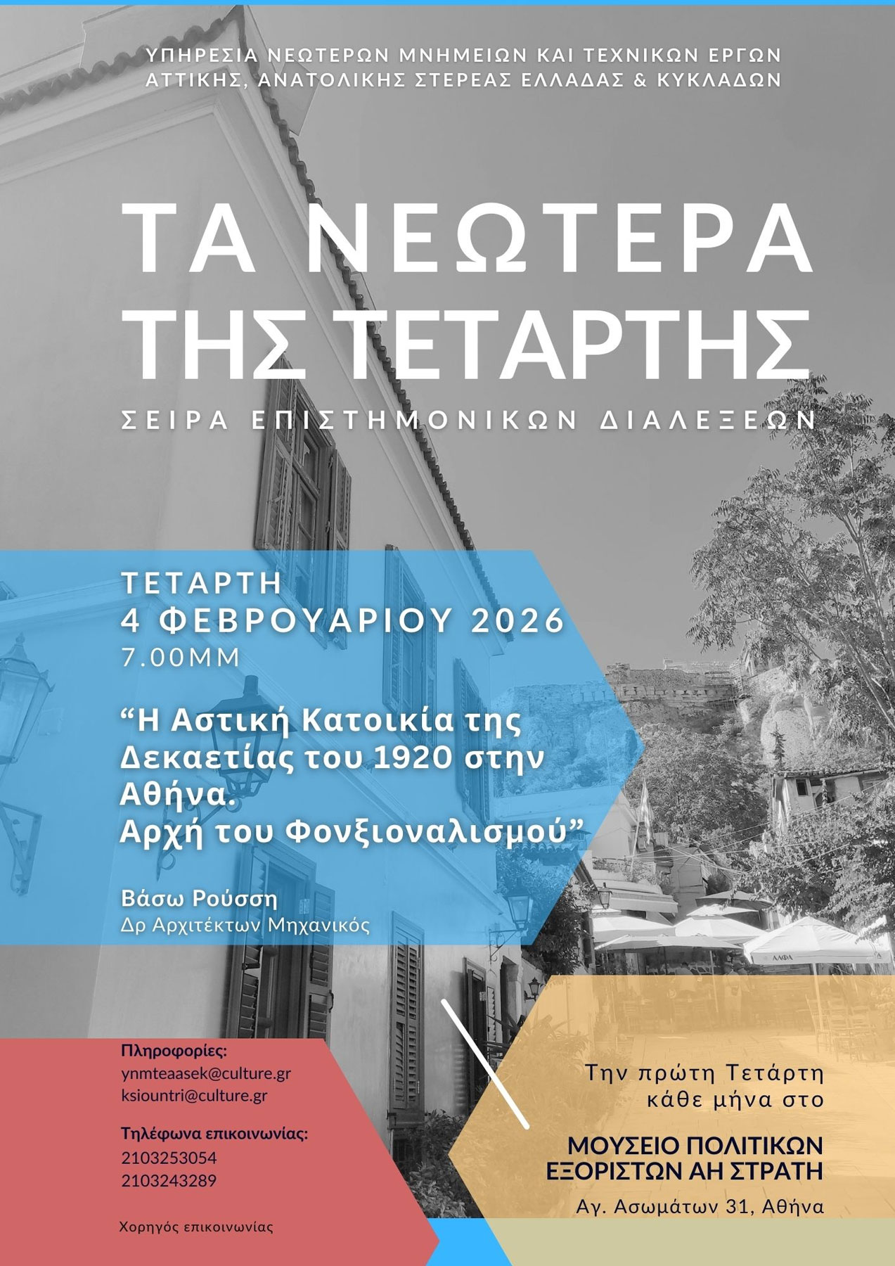 Τη διάλεξη διοργανώνει η Υπηρεσία Νεωτέρων Μνημείων και Τεχνικών Έργων Αττικής, Ανατολικής Στερεάς Ελλάδας και Κυκλάδων, στο πλαίσιο του πρώτου κύκλου διαλέξεων «Τα Νεώτερα της Τετάρτης».