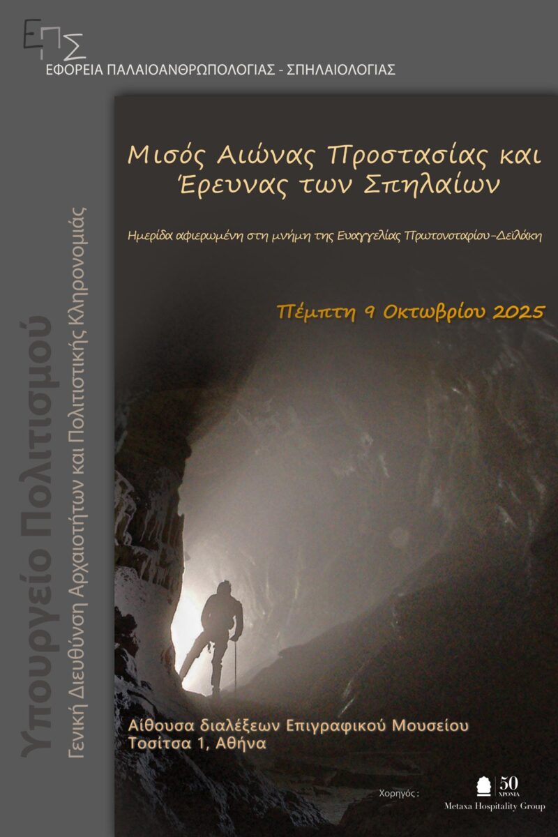 Ημερίδα αφιερωμένη στη μνήμη της Ευαγγελίας Πρωτονοταρίου-Δεϊλάκη με τίτλο «Μισός αιώνας προστασίας και έρευνας των σπηλαίων» διοργανώνουν η Εφορεία Παλαιοανθρωπολογίας-Σπηλαιολογίας και η Γενική Διεύθυνση Αρχαιοτήτων και Πολιτιστικής Κληρονομιάς του Υπουργείου Πολιτισμού.