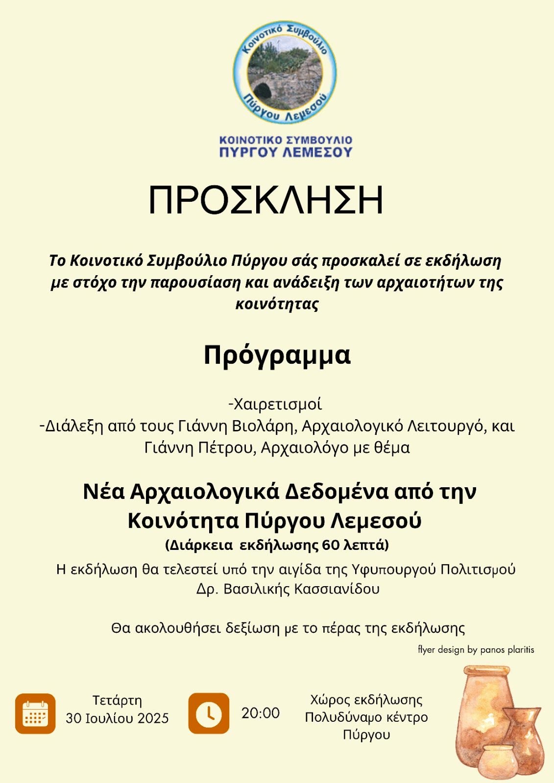 Εκδήλωση με στόχο την παρουσίαση και ανάδειξη των αρχαιοτήτων της Κοινότητας Πύργου Λεμεσού διοργανώνει το Κοινοτικό Συμβούλιο.