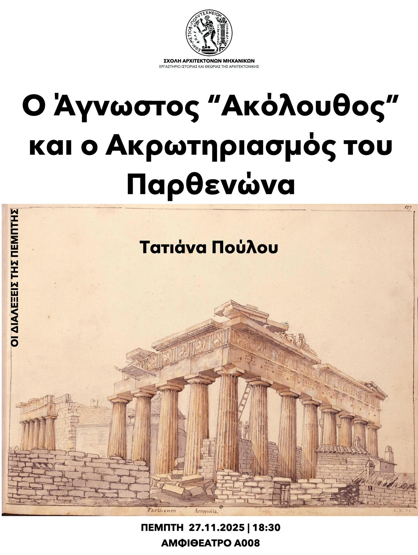 Διάλεξη της Τατιάνας Πούλου (Εφορεία Αρχαιοτήτων Πόλης των Αθηνών) με τίτλο «Ο Άγνωστος “Ακόλουθος” και ο Ακρωτηριασμός του Παρθενώνα».