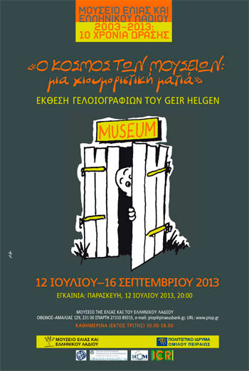 Η έκθεση γελοιογραφιών του Νορβηγού Geir Helgen με τίτλο «Ο κόσμος των μουσείων: μια χιουμοριστική ματιά» θα παρουσιαστεί στο Μουσείο Ελιάς και Ελληνικού Λαδιού στη Σπάρτη, στο πλαίσιο των εκδηλώσεων που διοργανώνει το Πολιτιστικό Ίδρυμα Ομίλου Πειραιώς με αφορμή τη συμπλήρωση δέκα χρόνων δράσης του Μουσείου.