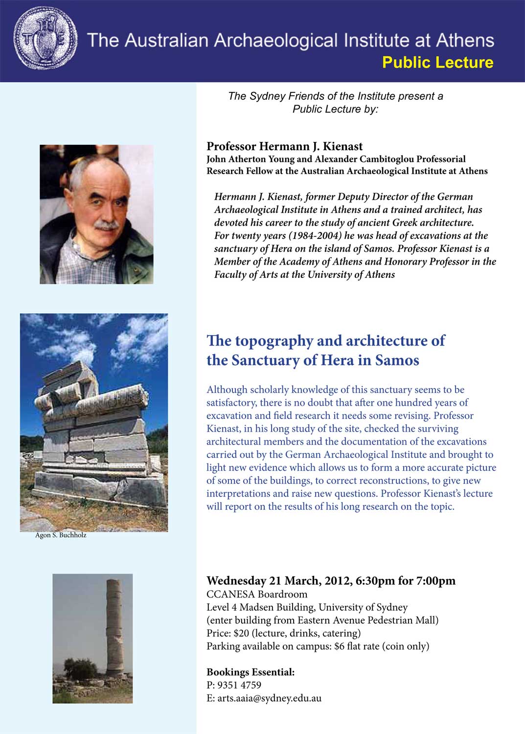 Παρότι οι επιστημονικές γνώσεις για το ιερό αυτό μοιάζουν να είναι ικανοποιητικές, δεν υπάρχει αμφιβολία ότι ύστερα από εκατό χρόνια ανασκαφών και έρευνας πεδίου στη θέση χρειάζονται κάποια αναθεώρηση. Ο καθηγητής Hermann Kienast, στην εκτενή έρευνά του, μελέτησε τα σωζόμενα αρχιτεκτονικά μέλη και τις δημοσιεύσεις για τις ανασκαφές που διενήργησε το Γερμανικό Αρχαιολογικό Ινστιτούτο και έφερε στο φως νέα στοιχεία που μας επιτρέπουν να σχηματίσουμε μια πιο ακριβή εικόνα ορισμένων από τα κτίρια, να δώσουμε νέες ερμηνείες και να θέσουμε καινούργια ερωτήματα. Στη διάλεξή του ο καθηγητής θα εκθέσει τα συμπεράσματα των ερευνών του πάνω στο θέμα.