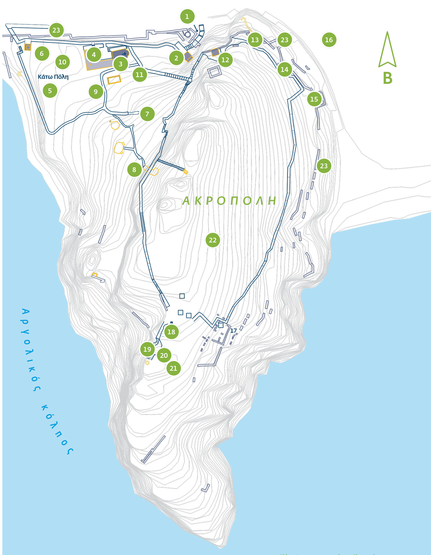 Μετά την ολοκλήρωση της περιήγησης εντός των τειχών της Ασίνης και βγαίνοντας από την αρχαία πύλη της πόλης, ο επισκέπτης μπορεί να ακολουθήσει τον αμαξιτό δρόμο προς ανατολικά και κατόπιν νότια, έως την παραλία της Πλάκας. Από εδώ θα έχει τη δυνατότητα να δει την ισχυρή ελληνιστική οχύρωση, την είσοδο προς την ακρόπολη και να θαυμάσει τον εντυπωσιακό ανατολικό πύργο. Ταυτόχρονα, με ευκολία θα διακρίνει τις διαφορετικές κατασκευαστικές φάσεις του τείχους.