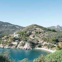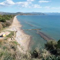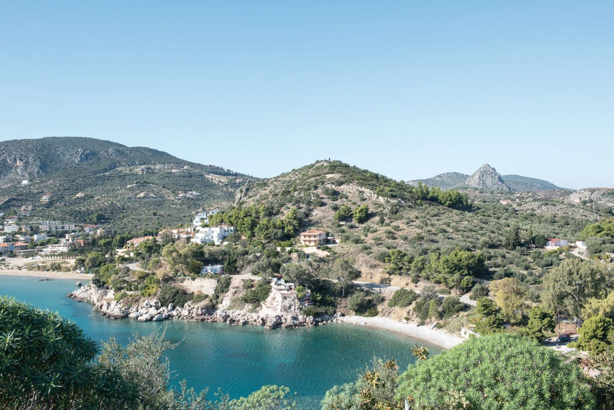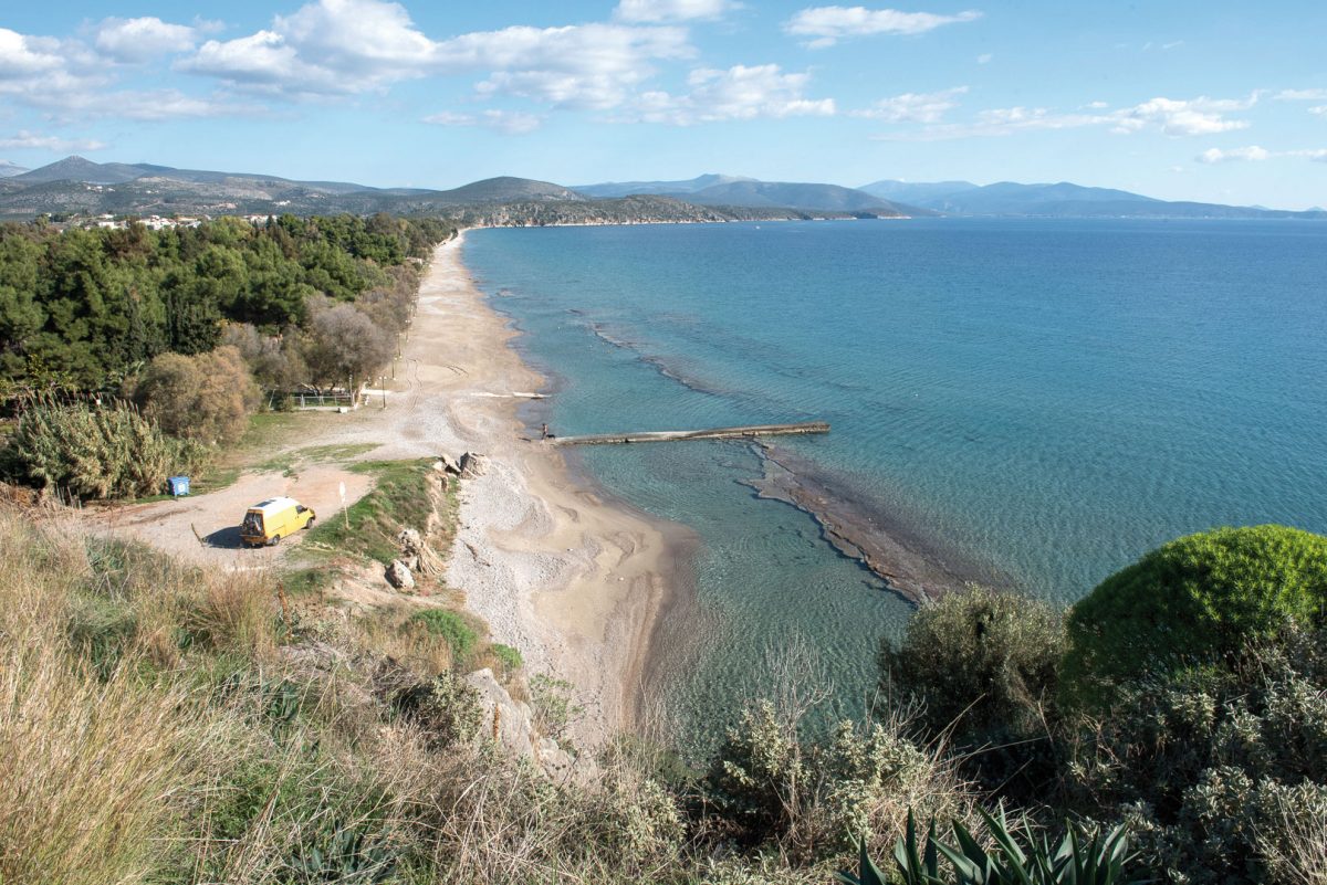 Συνεχίζουμε την ανάβαση προς την ακρόπολη, ακολουθώντας το κατασκευασμένο από ξύλινα στοιχεία μονοπάτι. Στα αριστερά και έως τη χερσόνησο «Νησί» στην απέναντι πλευρά, απλώνεται η παραλία της Πλάκας Δρεπάνου. Την 6η χιλιετία π.Χ., η ακτογραμμή εκτεινόταν σχεδόν 700 μ. βορειότερα, σύμφωνα με τον Zangger.