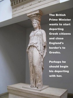 Πρόκειται για μια φωτογραφία με την εικόνα της “ξενιτεμένης” Καρυάτιδας του Βρετανικού Μουσείου και το μήνυμα “Ο Βρετανός πρωθυπουργός θέλει να ξεκινήσει να απελαύνει Έλληνες πολίτες και να κλείσει τα σύνορα της Αγγλίας στους Έλληνες. Ίσως θα έπρεπε να ξεκινήσει την απέλαση με αυτήν”.