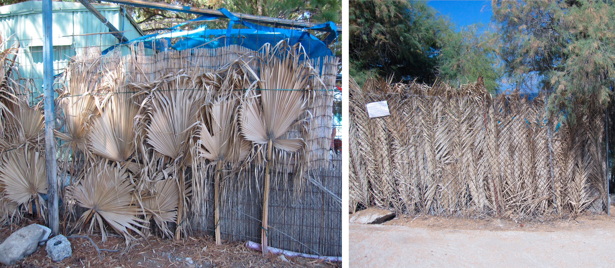 Κάπου στον Kορινθιακό Kόλπο βρίσκονται αυτές οι δύο «μάντρες» που μας δείχνουν τη σωστή χρήση των φυσικών υλικών. Με τον ίδιο τρόπο και οι αρχαίοι, με τη βοήθεια πασσάλων, έφτιαχναν μάντρες χρησιμοποιώντας τα φύλλα των φοινίκων και κλαδιά άλλων φυτών.
