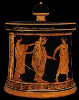 Παράδειγμα η πυξίδα του 5ου αιώνα από το Μουσείο του Λούβρου, στην οποία εικονίζεται μια νύφη που οδηγείται στο γαμπρό. Η ατολμία του κοριτσιού είναι έκδηλη στη στάση του σώματος, που είναι σφιγμένο. Το κεφάλι σκυφτό, δείχνει υποταγή. Το χέρι αφήνεται, άνευρο, να την οδηγούν. Τα πόδια είναι στυλωμένα στο έδαφος από το φόβο. Ο καλλιτέχνης ήξερε καλά τη γυναικεία ψυχή…