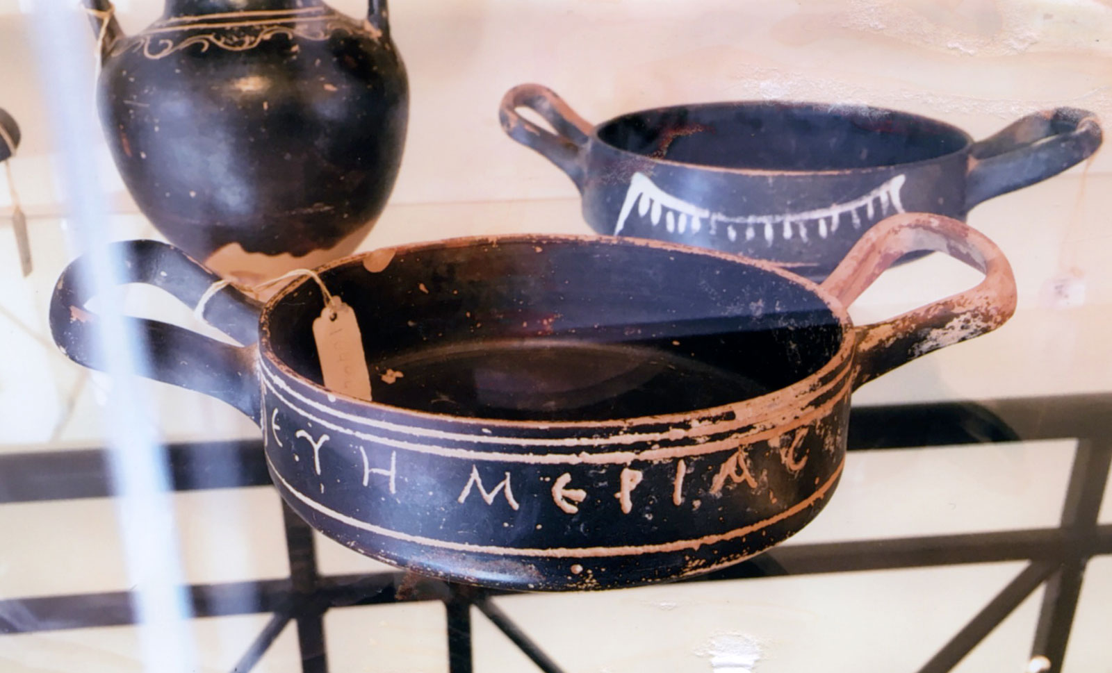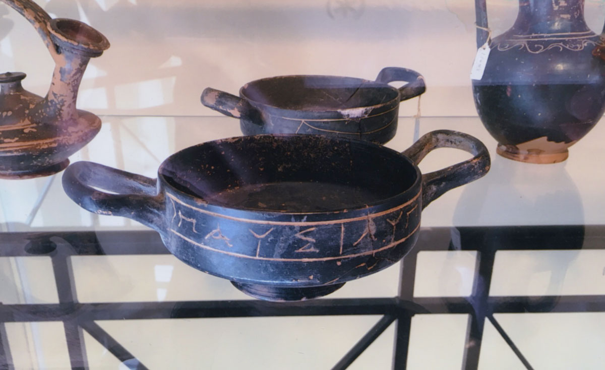Οι δύο κύλικες που φαίνονται στις φωτογραφίες, με εγχάρακτες τις λέξεις «παυσίλυπος» και «ευημερίας», δείχνουν τη σχέση του πότη με το αντικείμενο που του προσφέρει χαρά και ευεξία!