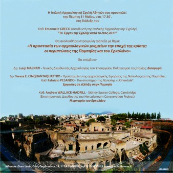 Την Πέμπτη 31 Μαΐου 2012 και ώρα 5.30 μ.μ. θα γίνει η έκθεση του έργου της Ιταλικής Αρχαιολογικής Σχολής Αθηνών κατά το 2011 από τον Διευθυντή της Σχολής Καθ. Emanuele Greco.