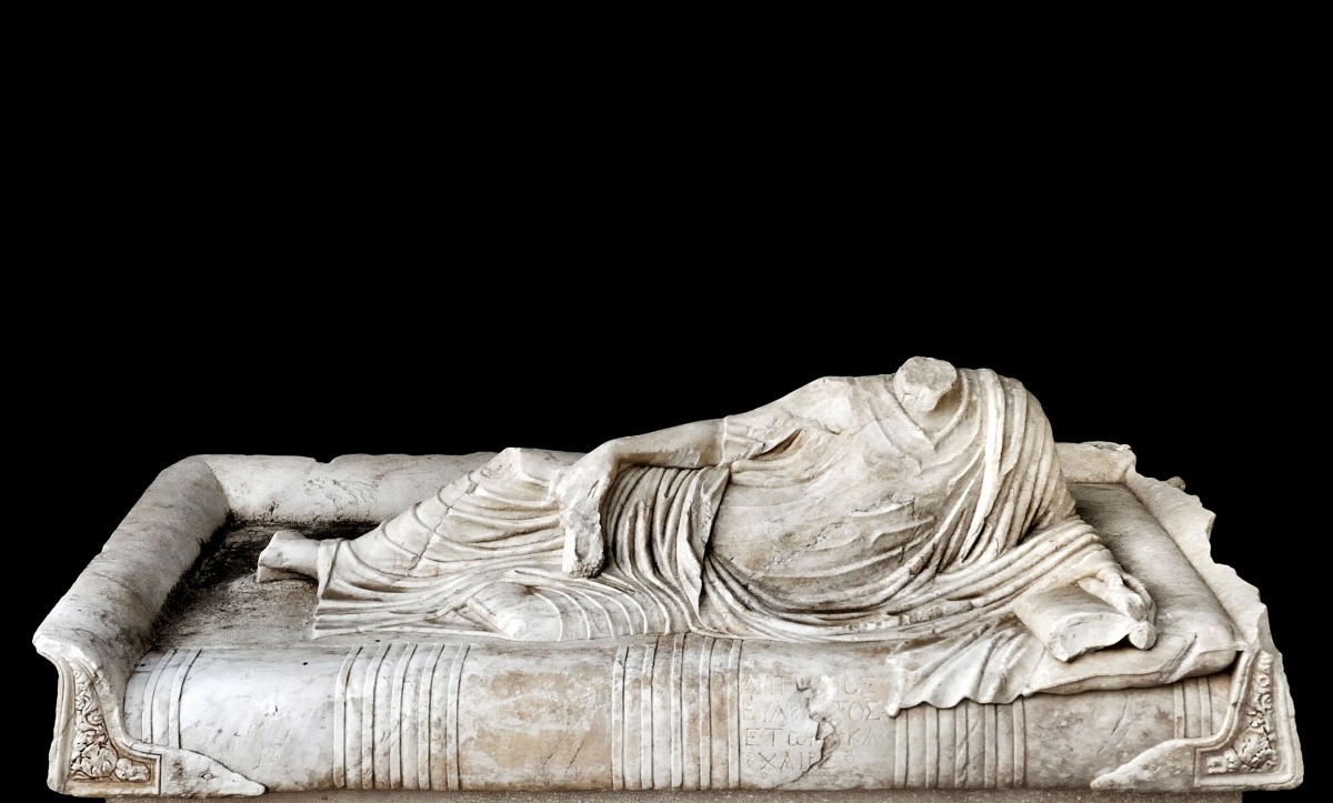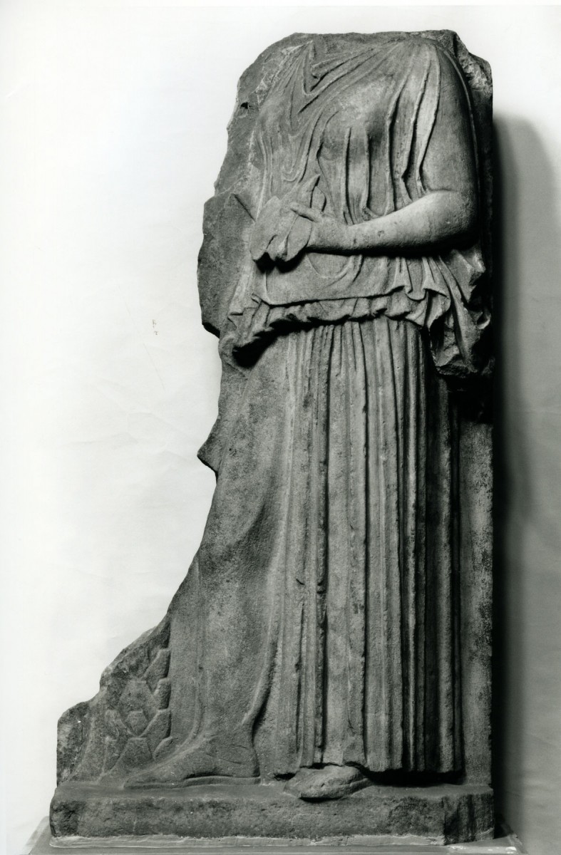Η δρ Έλενα Βλαχογιάννη, Επιμελήτρια στη Συλλογή Έργων Γλυπτικής του Εθνικού Αρχαιολογικού Μουσείου, παρουσιάζει μια τιμητική στήλη με ανάγλυφη παράσταση γυναικείας μορφής.