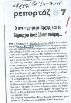 Εικ. 2. Δημοσίευμα στην εφημερίδα «Αργολίδα» (11-3-2016) με τίτλο «Ο αντιπεριφερειάρχης και οι δήμαρχοι διαβάζουν ποίηση».