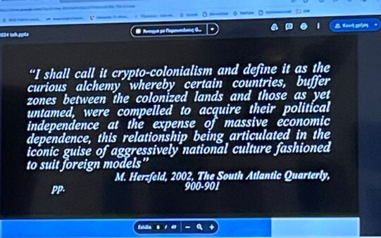 Και κάπως έτσι ερχόμαστε στο 2002, οπότε ο Μ. Χέρτσφελντ διατυπώνει έναν άλλο όρο-τομή: την ιδέα της κρυπτοαποικίας, η οποία αφορά χώρες που δεν ήταν αποικίες αλλά εντάσσονταν στη σφαίρα επιρροής μεγάλων δυνάμεων/ μητροπόλεων. Μέσα στο πλαίσιο της επιρροής αυτής, οι περιφερειακές αυτές χώρες «καταναλώνουν την εικόνα που κατασκευάζουν γι αυτές οι μητροπόλεις», χρησιμοποιώντας την ως εργαλείο στην προσπάθειά τους για αυτοπροσδιορισμό κι ελευθερία. Ένα τέτοιο παράδειγμα είναι η χρήση από τη σύγχρονη Ελλάδα της εικόνας της κλασικής αρχαιότητας ή της εποποιίας του Μεγάλου Αλεξάνδρου στην Ασία όπως όμως είχε διαμορφωθεί από τους Ευρωπαίους «αρχαιοδίφες» κατά την Αναγέννηση και τον Διαφωτισμό, και μέσα από το πρίσμα της ρωμαϊκής κληρονομιάς.