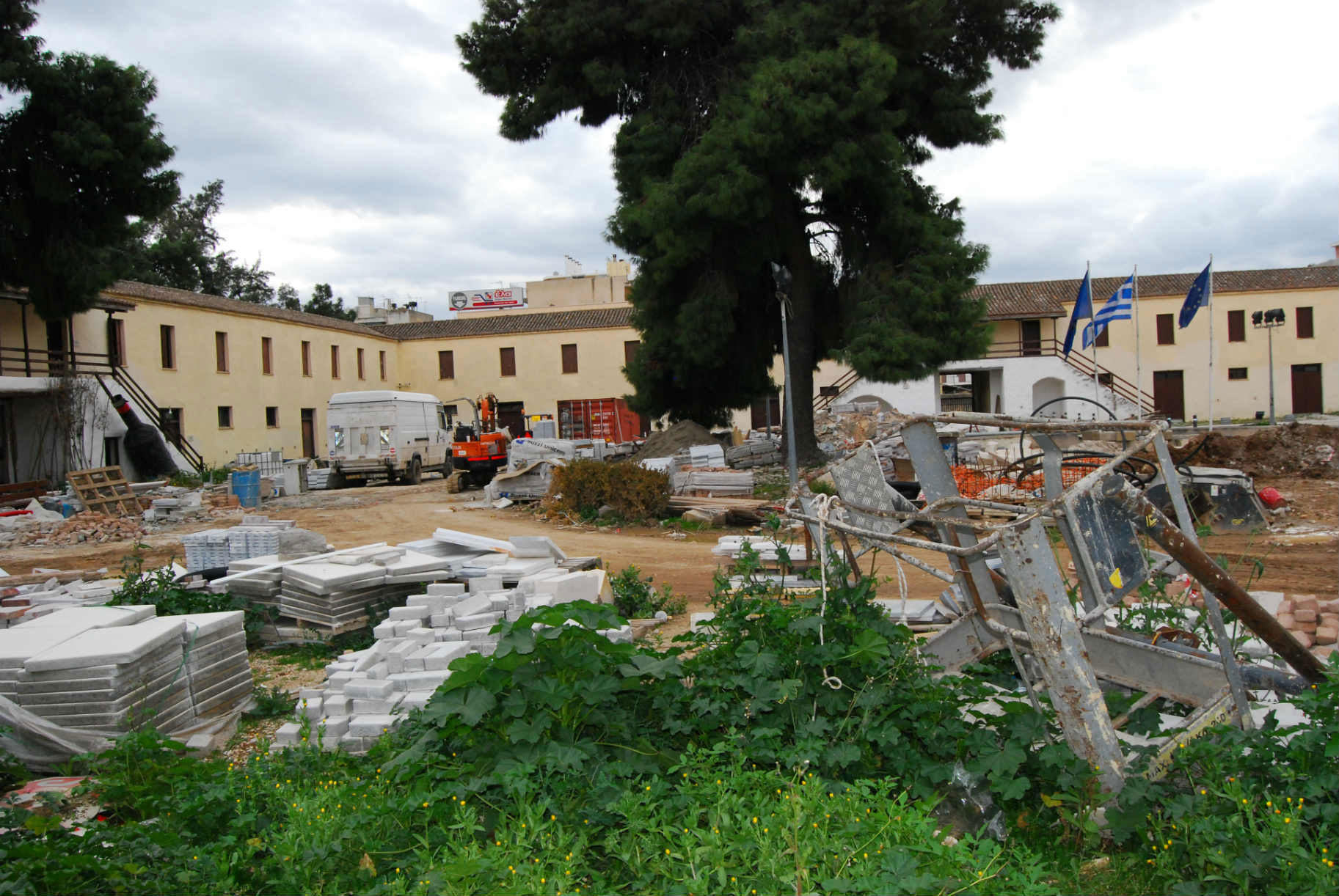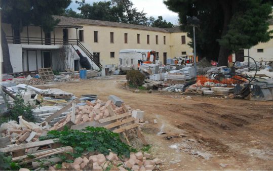 [Εικ. 1. Από τις εργασίες στο εξωτερικό του παλιού Δημαρχείου του Άργους. Εικ. 2-3. Το προαύλιο των Στρατώνων Καποδίστρια.]