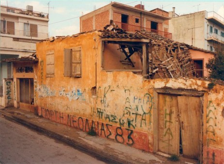Εικ. 1. Οικία Μακρυγιάννη. Φωτογραφία της καταρρέουσας στέγης εξώστου και εν συνεχεία και της οικίας. Η φωτογραφία είναι από τεύχος που διένεμε ο ίδιος ο ιδιοκτήτης για να πείσει το ΣτΕ για την ακύρωση του χαρακτηρισμού. Ο εξώστης έφθανε ως την θύρα της περιμάνδρωσης, η στέγασή του όμως και πέρα αυτής (βλ. εικ. 2).