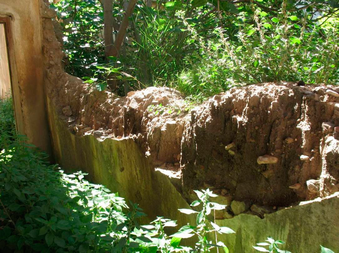 Εικ. 12. Τμήμα του τοίχου προς το μέρος της αυλής, αποσαθρωμένο και ερειπωμένο. Ο Νόμος όμως επιτάσσει την αποκατάσταση του διατηρητέου κτηρίου.