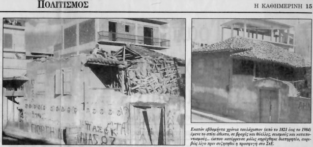 Εικ. 2. Η Οικία Μακρυγιάννη προ και μετά την κατάρρευση της στέγης. Είναι σαφείς οι διαστάσεις τους και η ολική διάσταση του κτίσματος (άρθρο Μ. Καρδαμίτση-Αδάμη και Γ. Σαρηγιάννη, «Να μην γίνει πολυκατοικία ο Μακρυγιάννης», Καθημερινή, 21.3.1993).