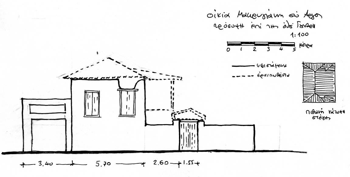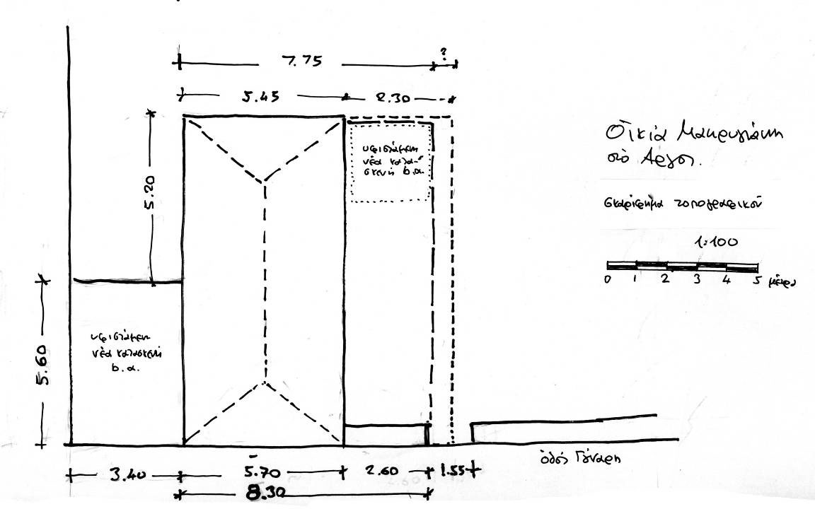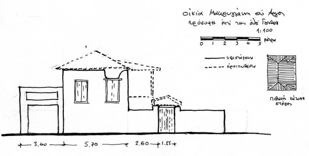 Εικ. 3-4. Σκαριφήματα τοπογραφικού και όψης (23.4.2012) όπου φαίνεται καθαρά η αρχική μορφή του κτηρίου, από την προεπαναστατική περίοδο μέχρι το 1982.