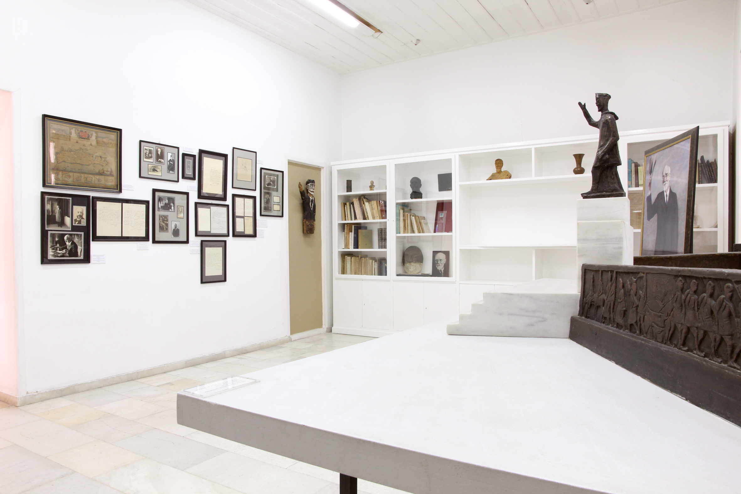 Άποψη αίθουσας εκδηλώσεων: βιβλιοθήκη με παλαιά βιβλία για τον Ελευθέριο Βενιζέλο, φωτογραφίες και χειρόγραφα του Βενιζέλου, αντικείμενα με τη μορφή του.
