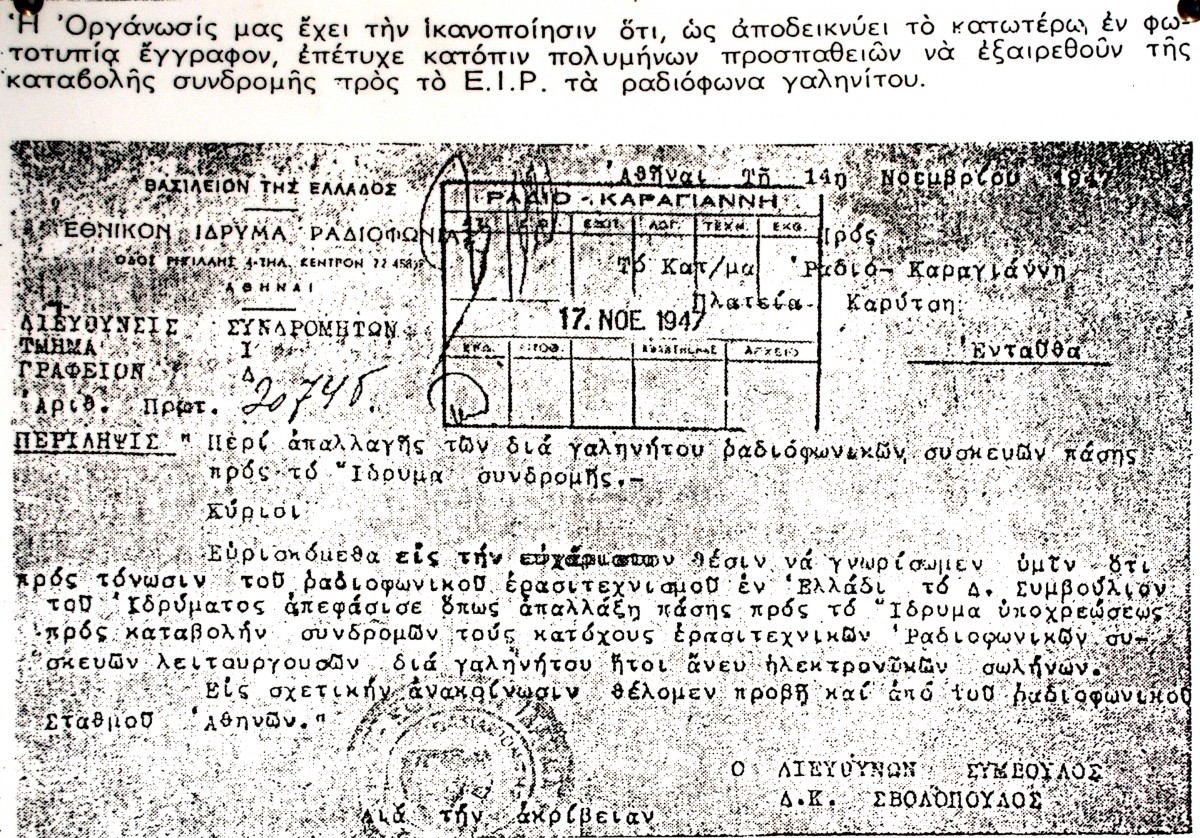 Απόφαση απο το 1947 του Εθνικού Ιδρύματος Ραδιοφωνίας, όπου απαλλάσει από τη συνδρομή προς το Ε.Ι.Ρ. τους κατόχους ραδιοφώνων με γαληνίτη.
