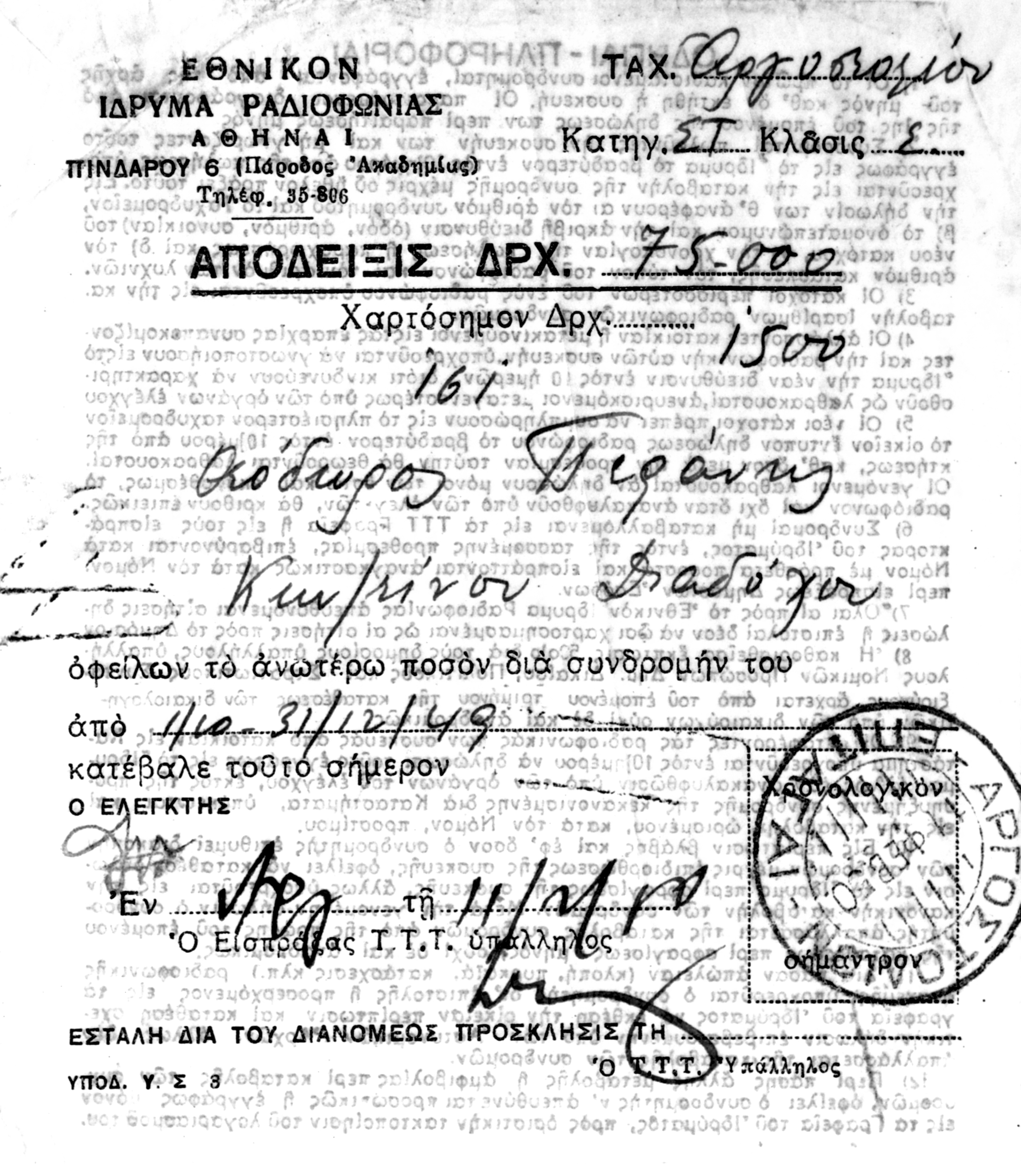 Απόδειξη είσπραξης συνδρομής που πλήρωσε ο κ. Θεόδωρος Περάνης προς το Εθνικό Ίδρυμα Ραδιοφωνίας.