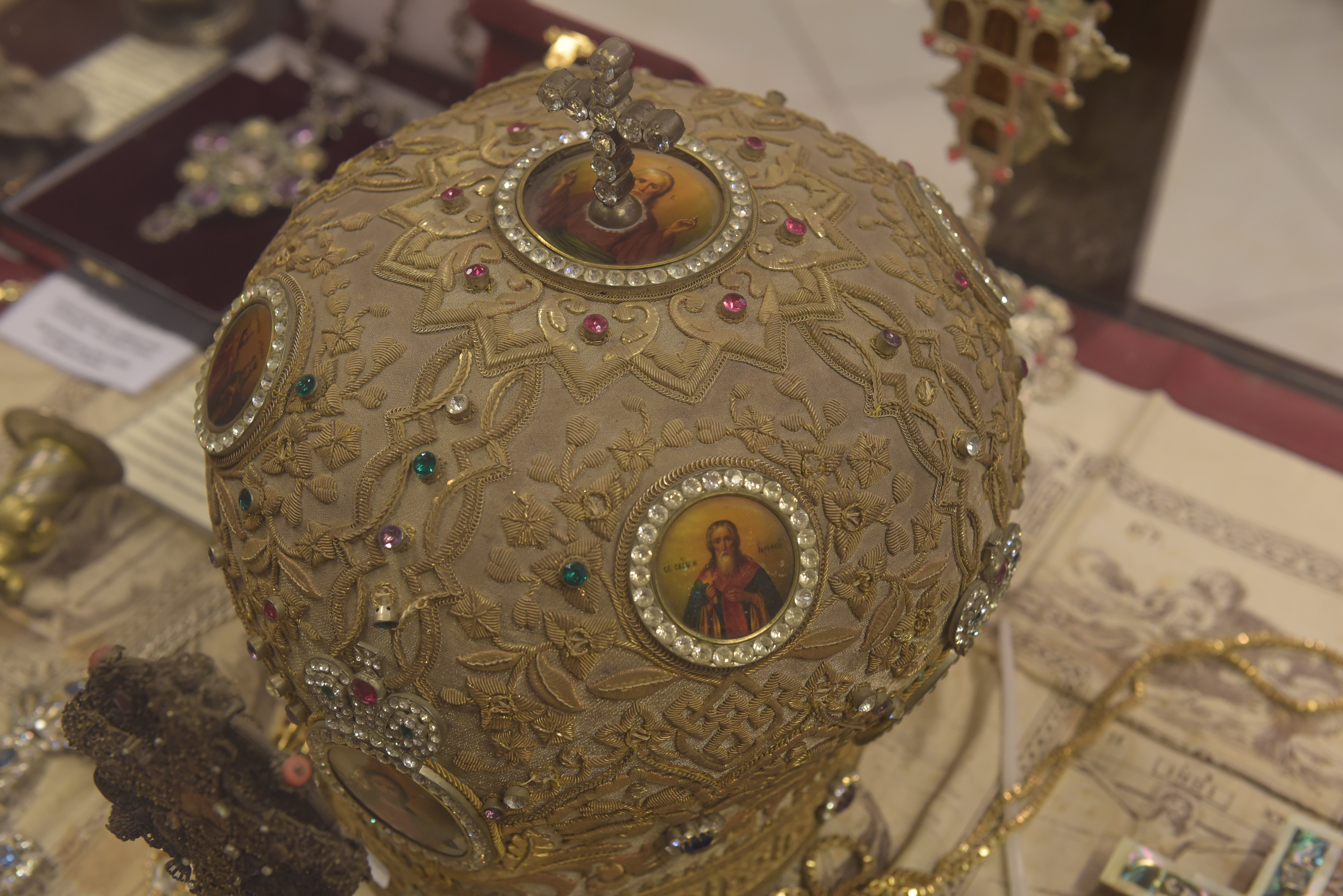Η εικονιζόμενη Αρχιερατική μίτρα έχει ύψος 0,28μ. και αποτελεί μία επιβλητική χρυσοκέντητη μίτρα με ασημί φόντο ρωσικής προέλευσης.