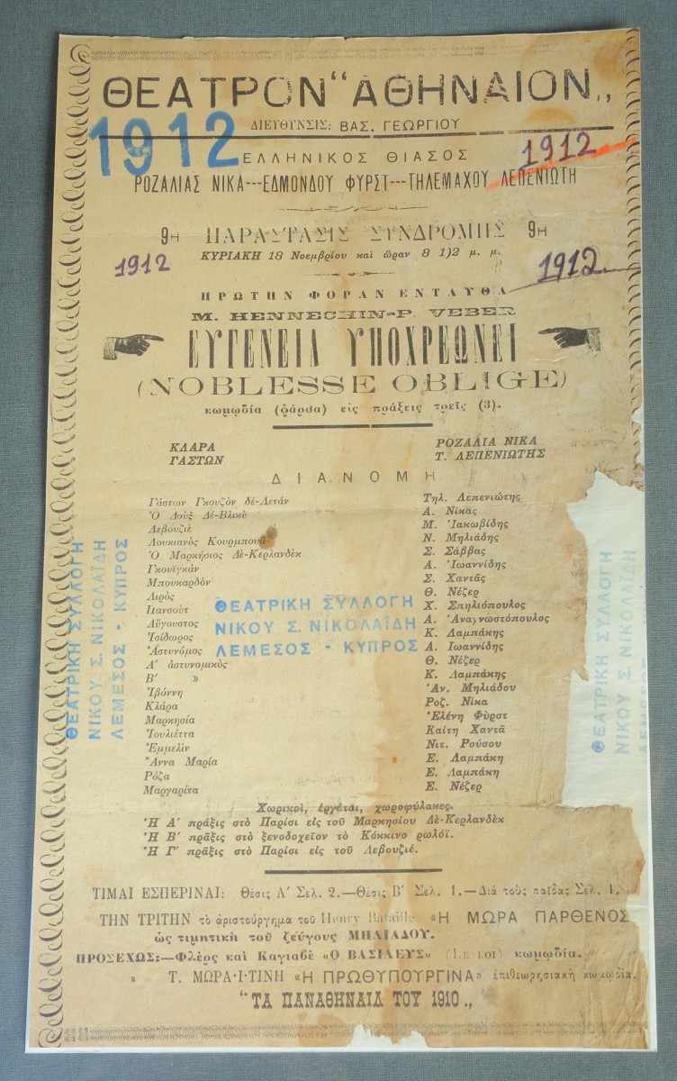 Το παλαιότερο ενημερωτικό φυλλάδιο για παράσταση ελληνικού θιάσου στην Κύπρο που κατάφερε να διασώσει στη Θεατρική Συλλογή του ο Νίκος Σ. Νικολαΐδης.