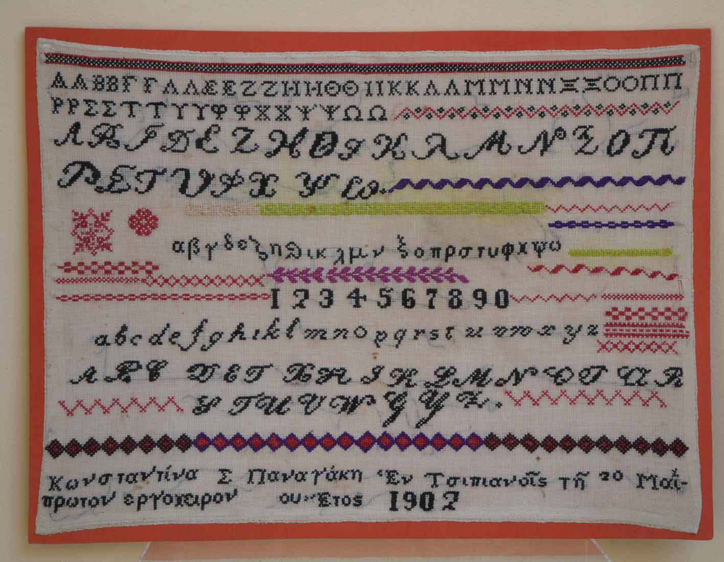 Κέντημα με την ελληνική και αγγλική αλφάβητο και το όνομα της δημιουργού: «Κωνσταντίνα Σ. Παναγάκη, Εν Τσιπιανοίς τη 20 Μαΐου Έτος 1902 – Πρώτον εργόχειρον».