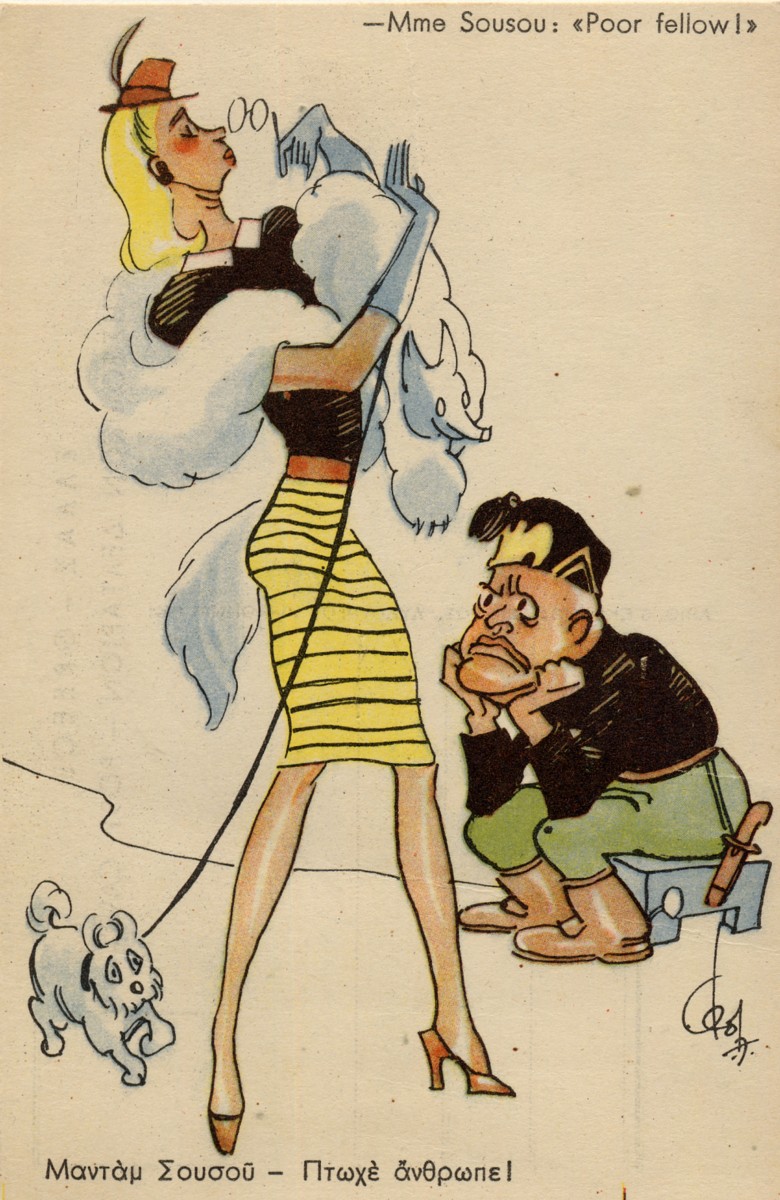 Γελοιογραφία του Φωκίωνος Δημητριάδη, 1940-1941. Επιστολικό δελτάριο.