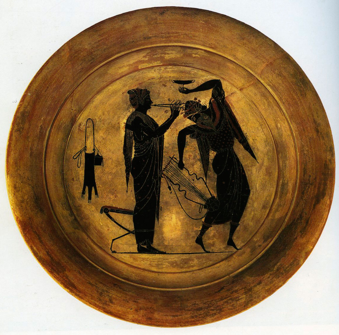 Αττικό μελανόμορφο πινάκιο, 520-510 π.Χ. Αποδίδεται στον αγγειογράφο Ψίακα. Εικονίζονται αυλήτρια και κωμαστής. Βασιλεία, Antikenmuseum und Sammlung Ludwig.
