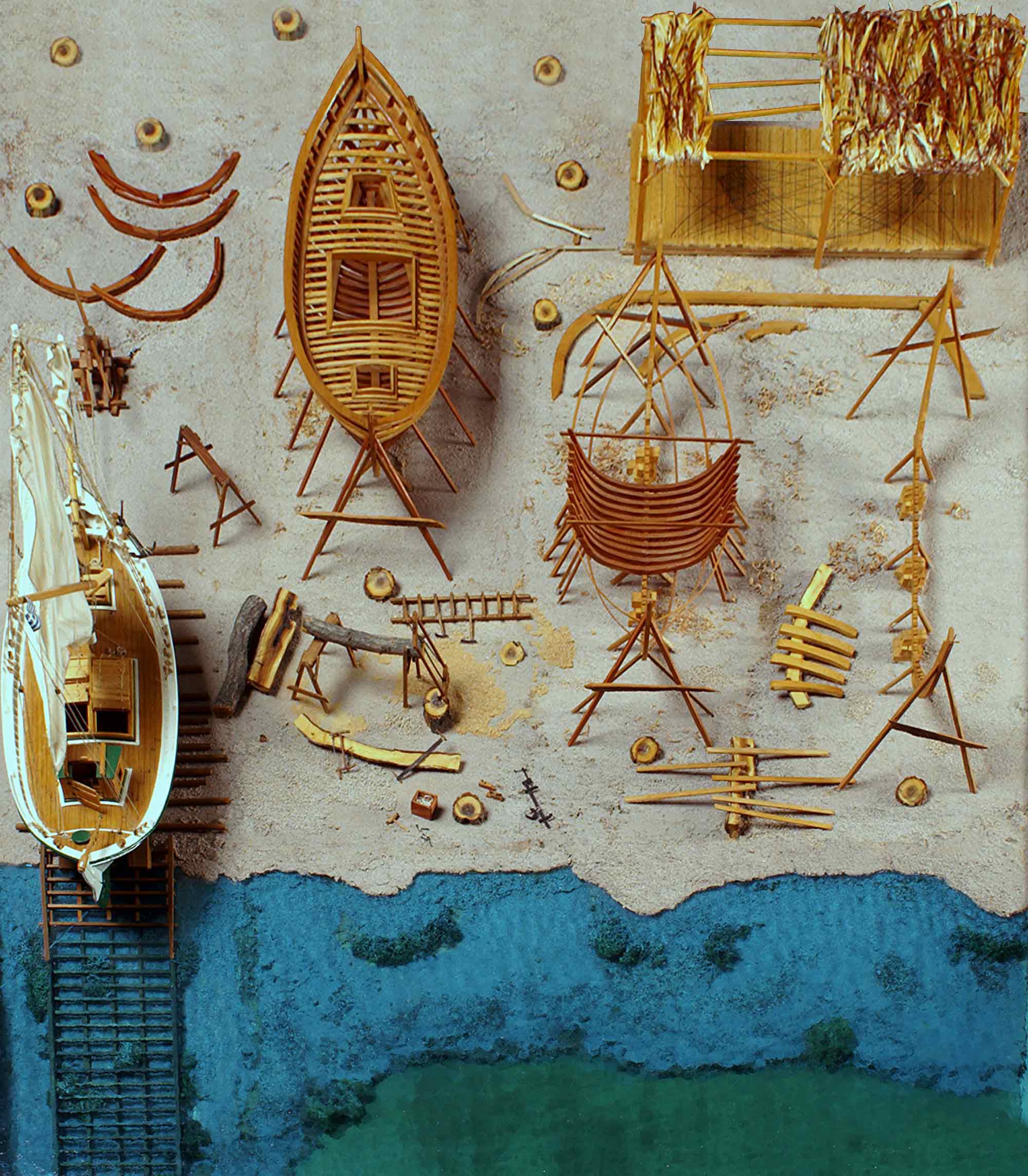 Στο διόραμα παρουσιάζονται τα βασικότερα στάδια κατασκευής ενός τρεχαντηριού: το πρώτο στάδιο με το στήσιμο της καρίνας, το δεύτερο με την κατασκευή του σκελετού και το τρίτο στάδιο με την επικάλυψη του σκελετού με σανίδες που διαμορφώνουν το πέτσωμα και την κουβέρτα. Επίσης στο τέλος της κατασκευής τοποθετούνται τα κατάρτια και η υπόλοιπη αρματωσιά του σκάφους.