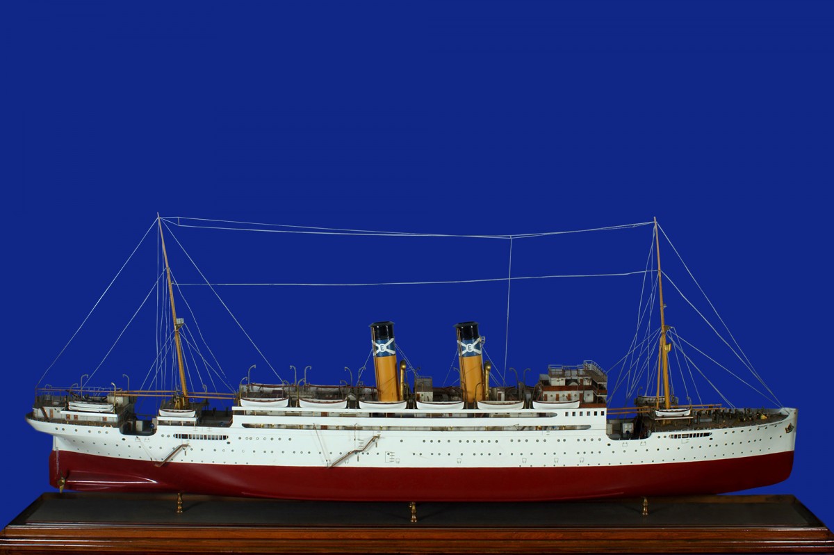 Ομοίωμα του υπερωκεανίου «Βασιλεύς Κωνσταντίνος». Κατασκευάστηκε στα ναυπηγεία Cammell, Laird and Co. στο Birkenhead της Αγγλίας το 1914 για λογαριασμό της Εθνικής Ατμοπλοΐας της Ελλάδος. Μπορούσε να μεταφέρει 1.800 επιβάτες και είχε 60 δίκλινες και τετράκλινες καμπίνες και συνολική χωρητικότητα 9.272 κόρων. Το πλοίο είχε παραγγελθεί προκειμένου να εξυπηρετήσει τις ανάγκες που είχε προκαλέσει το μεταναστευτικό ρεύμα προς την Αμερική. Ωστόσο το πλοίο, επειδή ξέσπασε ο Α’ Παγκόσμιος Πόλεμος, δεν παραδόθηκε στους ιδιοκτήτες του αλλά επιτάχθηκε από τη Βρετανική κυβέρνηση για να χρησιμοποιηθεί ως οπλιταγωγό.