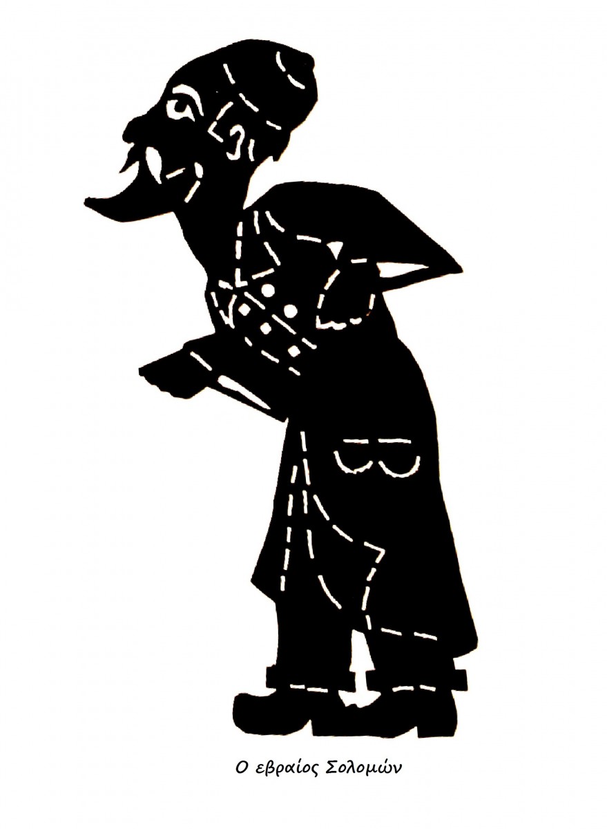 Οι Εβραίοι της Ελλάδας και οι Τσιγγάνοι συνήθιζαν, όπως και οι Έλληνες, να παίζουν θέατρο σκιών στα χρόνια της Οθωμανικής Αυτοκρατορίας. Είναι πολύ πιθανό, λοιπόν, η φιγούρα αυτή να είναι κατάλοιπο εκείνης της εποχής. Όταν αναφερόμαστε στον Εβραίο, πρέπει να διευκρινίσουμε πως αφορά ένα συγκεκριμένο τύπο της εβραϊκής κοινωνίας: τον έμπορο. Θα μπορούσε να αναφέρεται σε οποιονδήποτε έμπορο, οποιασδήποτε φυλής ή ράτσας. Είναι, άλλωστε, γνωστό το ταλέντο των Εβραίων, κυρίως της Θεσσαλονίκης, σε αυτό το επάγγελμα. Ο Εβραίος ο οποίος είναι και σπιτονοικοκύρης του Καραγκιόζη είναι πιεστικός στην είσπραξη των ενοικίων, φοβάται το δικαστήριο και φυσικά και τους καβγάδες. Δεν εισπράττει το Σάββατο κι ο Καραγκιόζης του λέει πως Θα τον πληρώσει μόνο Σάββατο. ‘ Έχει χαρακτηριστικά μακρόσυρτη ομιλία με πολλές ισπανικές λέξεις όμως πάντα είναι καλοντυμένος με τα πλουμιστά του ρούχα, το σιμίτι και τα ανατολίτικα πασουμάκια του, μιλά μια γλώσσα ακατάληπτη. Το σώμα του γέρνει μπροστά, το κεφάλι ακόμη περισσότερο Μοιάζει να ζητά μονίμως κάτι από τους άλλους και το απλωμένο χέρι του δείχνει ακριβώς τι: Το χρήμα. Σε αυτό είναι προσκολλημένος Μπορεί να είναι τσιγκούνης και τοκογλύφος, μπορεί και να είναι απλώς αφοσιωμένος στο να βγάζει λεφτά. Και το καταφέρνει! Στη σκηνή μπαίνει πάντα τραγουδώντας το τραγούδι του μέχρι σήμερα είναι το ίδιο: