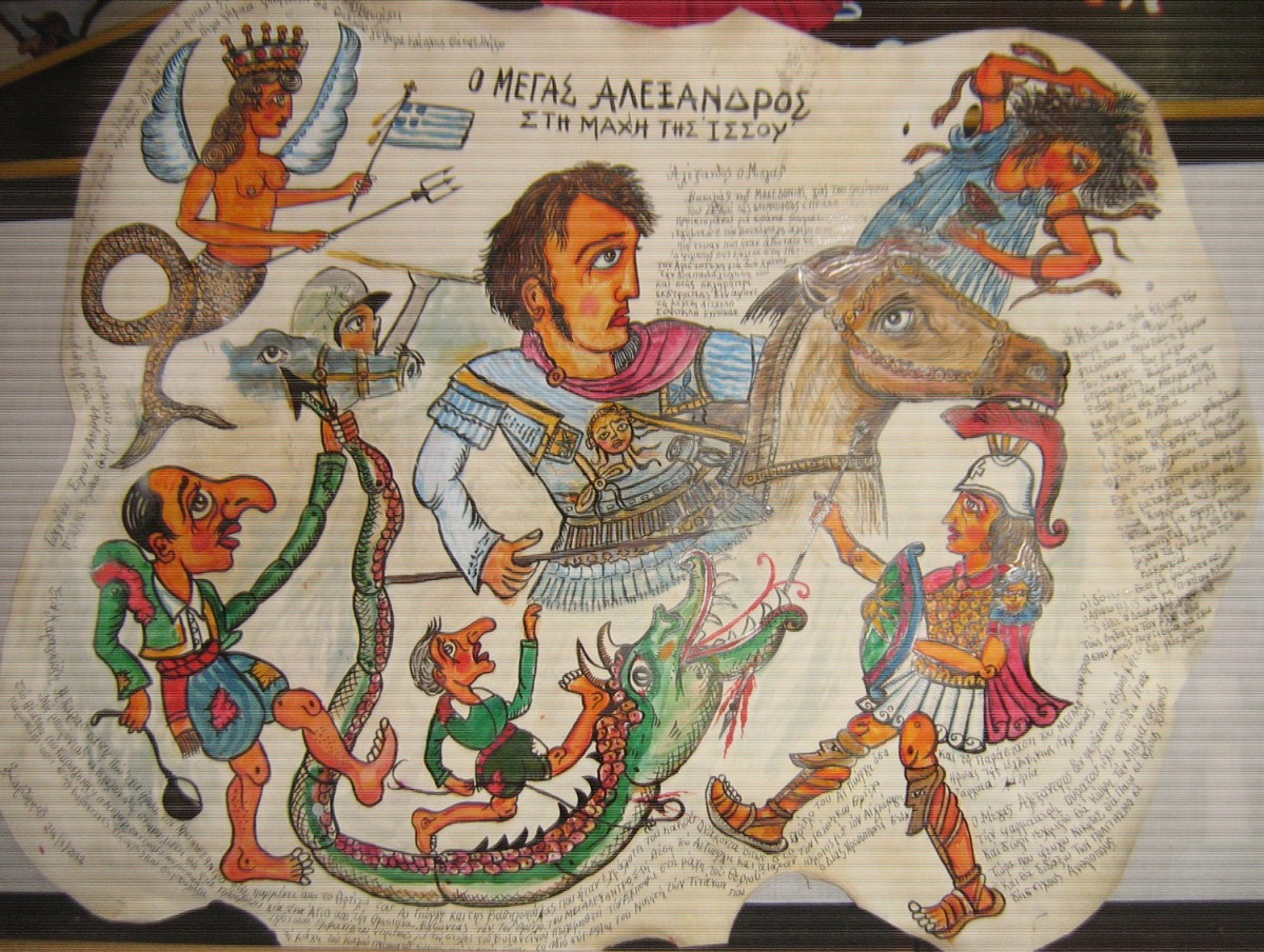 «Ο Μέγας Αλέξανδρος Στην Μάχη Της Ισσού» , είναι ζωγραφισμένο απο τον Σ. Χαρίδημο πάνω σε δέρμα.