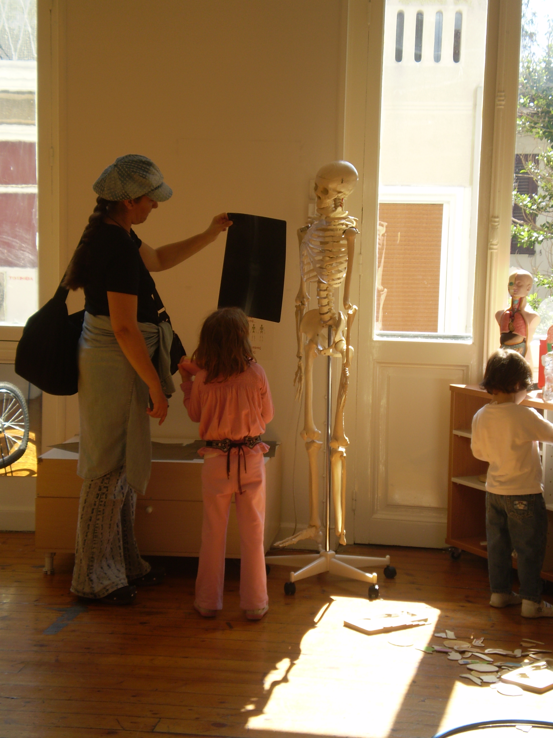 Παιδί και μητέρα ερευνούν και συγκρίνουν την ακτινογραφία της σπονδυλικής στήλης με το ομοίωμα του σκελετού.