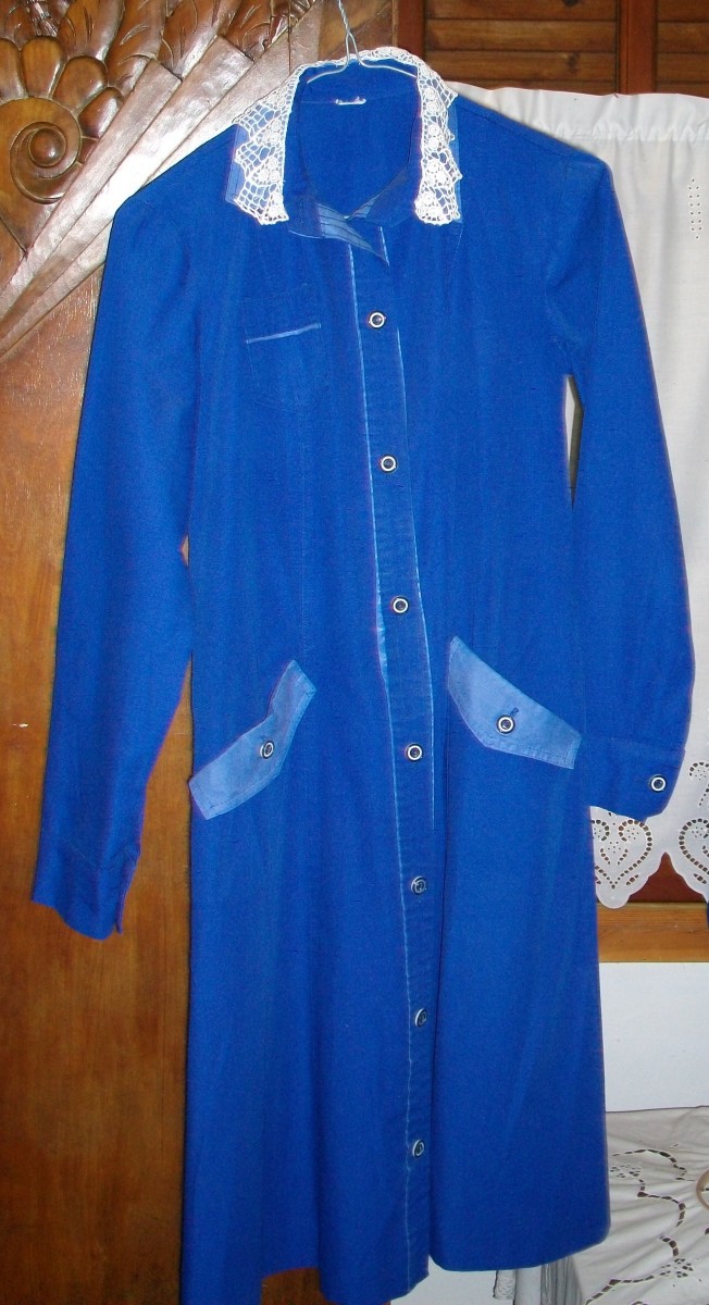 Τα κορίτσια φορούσαν τη μπλε ποδιά με άσπρο γιακά, ο οποίος ήταν συνήθως πλεκτός και οπωσδήποτε καθαρός και σιδερωμένος. Επίσης φορούσαν άσπρες τρουακάρ κάλτσες, μέχρι κάτω από το γόνατο όπου συναντούσαν την ποδιά. Μόνο το καλοκαίρι επιτρεπόταν να σηκώνουν τα μανίκια και να φορούν πέδιλα. Επάνω υπήρχε και ραμμένο το στρογγυλό σχήμα με Α, Β ή Γ ανάλογα σε ποια τάξη πήγαινε η μαθήτρια. Όλες οι ποδιές είχαν ζώνη.
