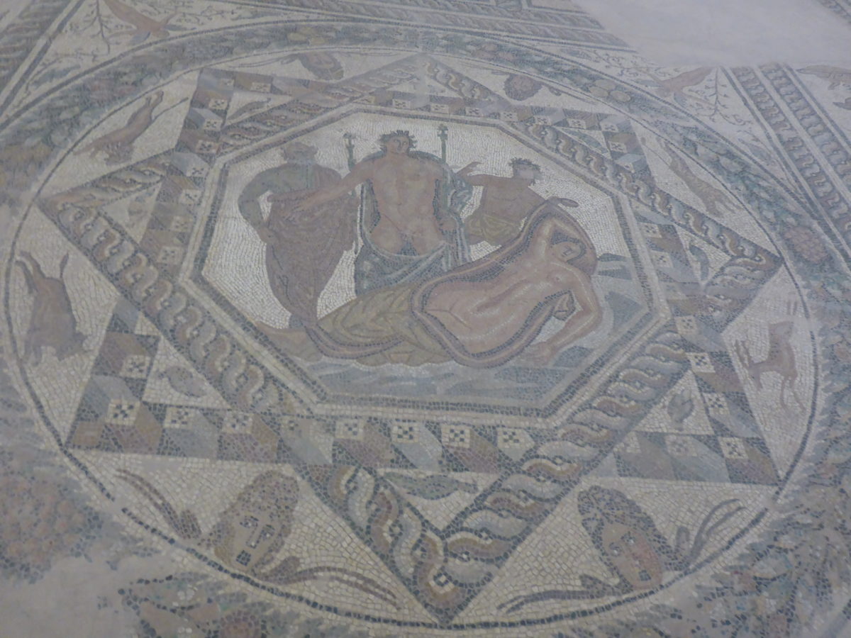 Τμήμα ψηφιδωτού δαπέδου από ιδιωτική, αστική έπαυλη της ρωμαϊκής Κυδωνίας. Στο κεντρικό τμήμα του δαπέδου, εντός οκταγωνικού πλαισίου, απεικονίζεται ο μύθος της ανεύρεσης της Αριάδνης από το Διόνυσο, ο οποίος πλαισιώνεται από ένα Παποσειληνό και έναν Σάτυρο.