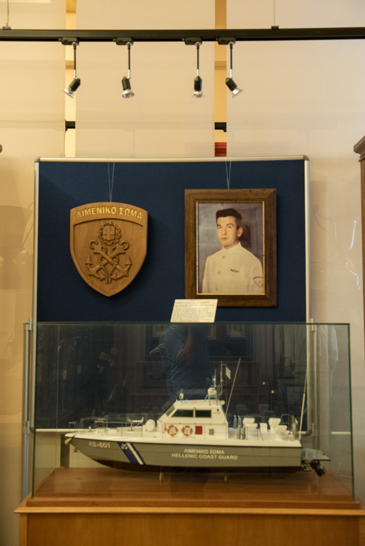 Στη προθήκη βλέπουμε ομοίωμα περιπολικού σκάφος του Λιμενικού Σώματος.