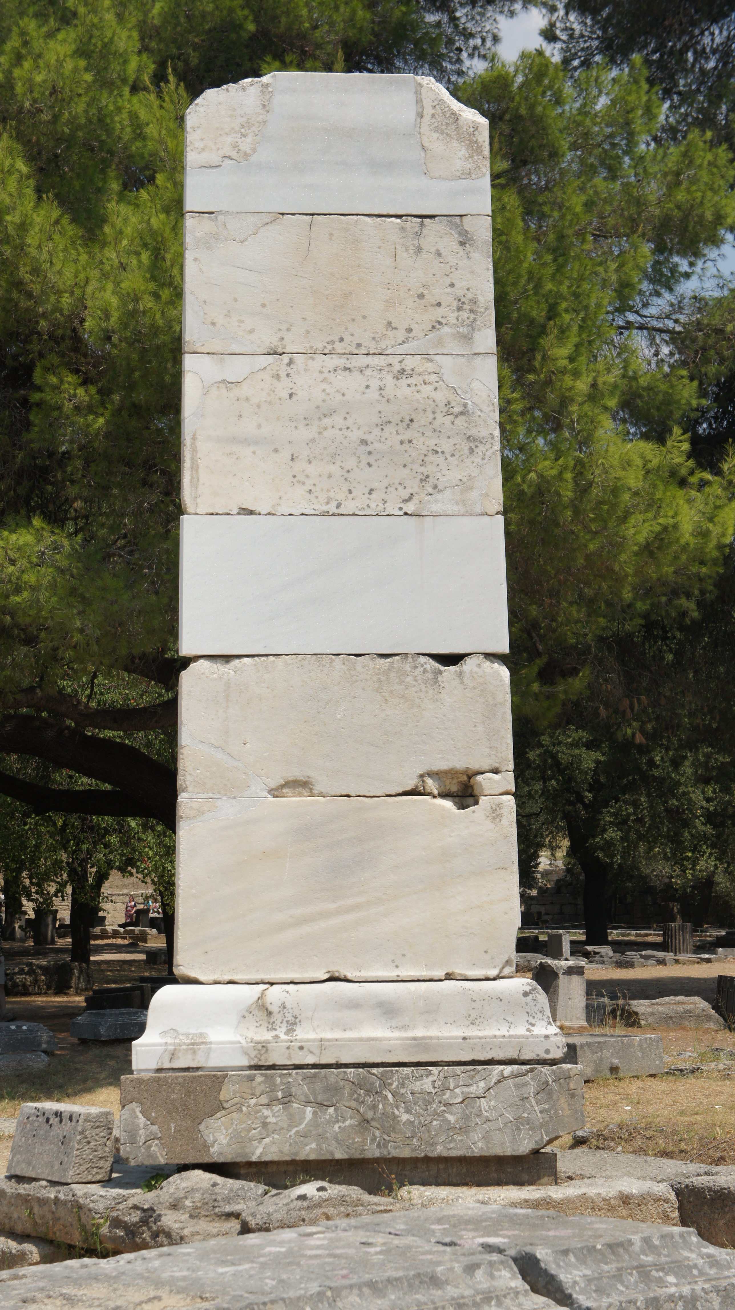 Πρόκειται για το τεράστιο βάθρο επάνω στο οποίο ήταν στημένη η Νίκη του Παιωνίου, το θαυμάσιο γλυπτό της κλασικής εποχής. Στην πρόσοψη του βάθρου είχε χαραχθεί αναθηματική επιγραφή, η οποία μας πληροφορεί ότι η Νίκη ήταν αφιέρωμα των Μεσσηνίων και των Ναυπακτίων στον Ολύμπιο Δία, για τη νίκη τους κατά των Λακεδαιμονίων στον Αρχιδάμειο πόλεμο, πιθανότατα το 421 π.Χ.: «ΜΕΣΣΑΝΙΟΙ ΚΑΙ ΝΑΥΠΑΚΤΙΟΙ ΑΝΕΘΕΝ ΔΙΙ ΟΛΥΜΠΙΩΙ ΔΕΚΑΤΑΝ ΑΠΟ ΤΩΜ ΠΟΛΕΜΙΩΝ?. Η γλώσσα που χρησιμοποιείται εδώ είναι δωρική, επειδή οι αναθέτες του μνημείου ήταν Δωριείς.
